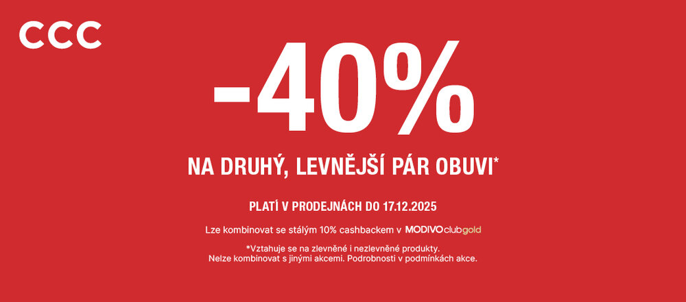 Je čas na nákupy - vyberte si dva páry obuvi a získejte 40% slevu na levnější pár! Známé značky nyní ještě levnější! Akce platí i na zlevněné produkty do 17. prosince v prodejnách CCC!