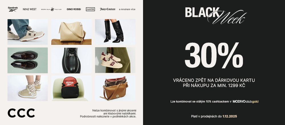 Získejte 30 % z hodnoty nákupu zpět na dárkovou kartu - stačí nakoupit za 1299 Kč. Čekají na Vás oblíbené značky a nejnovější trendy – nyní ještě výhodněji! Najděte svůj styl a doplňte si podzimní šatník. Neváhejte, akce platí v prodejnách CCC do 1. prosince!