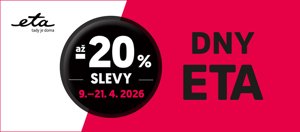 DNY ETA jsou tady! V termínu 9. 4. – 21. 4. 2026 můžete pořídit vybrané malé a velké domácí spotřebiče se slevou až 20 %. Nakupte na e-shopu ETA.cz nebo ve značkových prodejnách ETA a vybavte si domácnost opravdu výhodně.