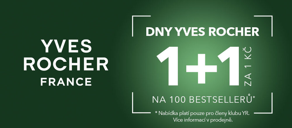 Využijte nabídku 1+1 za 1 Kč na 100 bestsellerů od rostlinné kosmetiky Yves Rocher! K nákupu jednoho z vybraných produktů získáte druhý ve stejné, nebo nižší hodnotě za 1 Kč. Nabídka platí pro stávající i nové členy klubu Yves Rocher od 13. 10. do 19. 10. 2025. Pokud ještě členy nejste, můžete se jednoduše registrovat v naší prodejně a okamžitě začít čerpat klubové výhody. Více informací o akci i věrnostním klubu v prodejně Yves Rocher.
