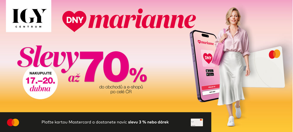 - Sleva 25 % na jeden libovolný neakční produkt. Přesné znění slevy najdete v časopise u naší nabídky v sekci Dny Marianne.
