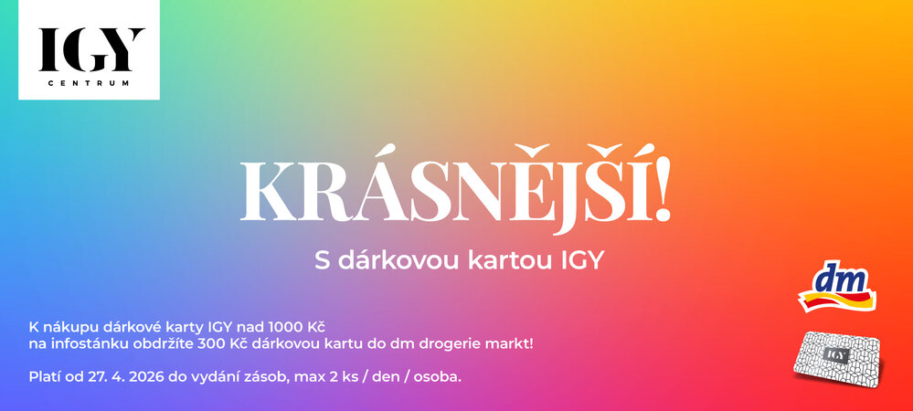K nákupu dárkové karty IGY v hodnotě nad 1 000 Kč získáte na infostánku OC dm dárkovou kartu v hodnotě 300 Kč zdarma.