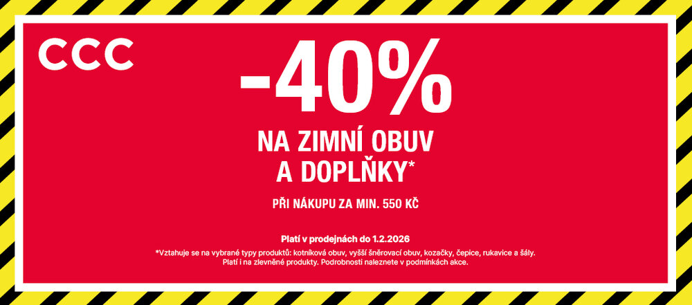 Získejte slevu 40 % na zimní obuv a doplňky při nákupu za min. 550 Kč v prodejnách CCC. Oživte si svůj zimní šatník ještě dnes! Akce platí i na zlevněné produkty do 1.2.2026.