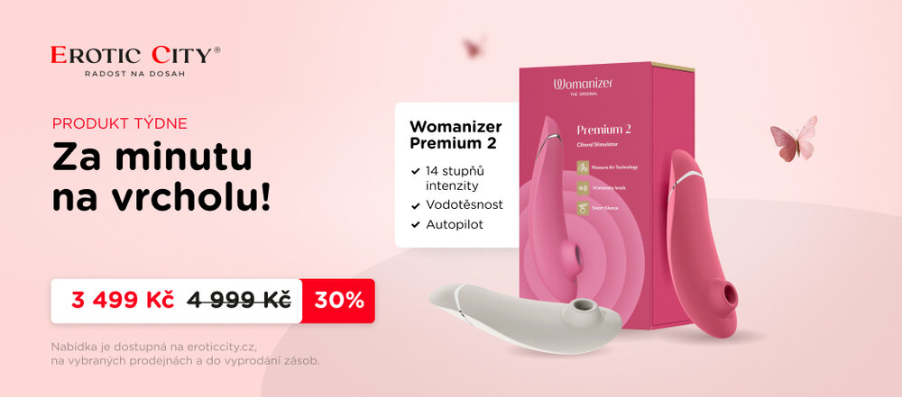 Produkt týdne – Womanizer Premium 2 se slevou 30 %! Od 5. 2. do 11. 2. 2026 v prodejně Erotic City legendární Womanizer Premium 2 za zvýhodněnou cenu. Tento prémiový stimulátor s revoluční technologií Pleasure Air je ideálním valentýnským dárkem pro každou ženu. Využijte limitovanou nabídku a darujte radost, která skutečně potěší!
